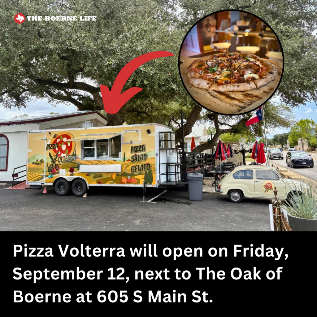 Authentic Roman pizza is rolling into The Oak of Boerne’s parking lot at 605 S Main St. The new Pizza Volterra trailer is set to start serving on September 12, with dining on the terrazza or to-go ordering. A soft opening may happen ahead of the official launch; keep an eye on their channels for updates. Learn more about them here.