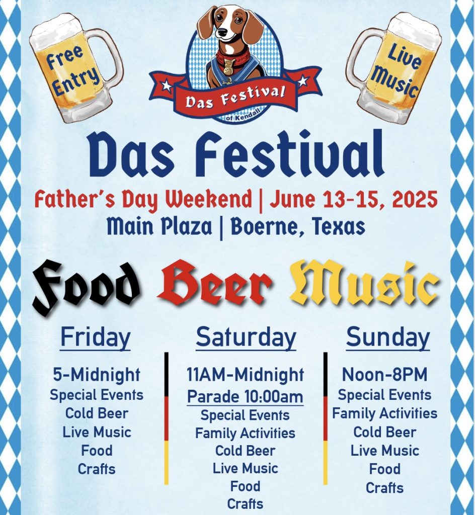 Das Festival of Kendall returns for its second year on Father’s Day weekend 2025, now in its new location at Main Plaza on the Hill Country Mile, right in the heart of Boerne! After a successful inaugural event in 2024 at Random Beer Garden, this year’s festival moves to the center of town to bring even more excitement and accessibility to the celebration.