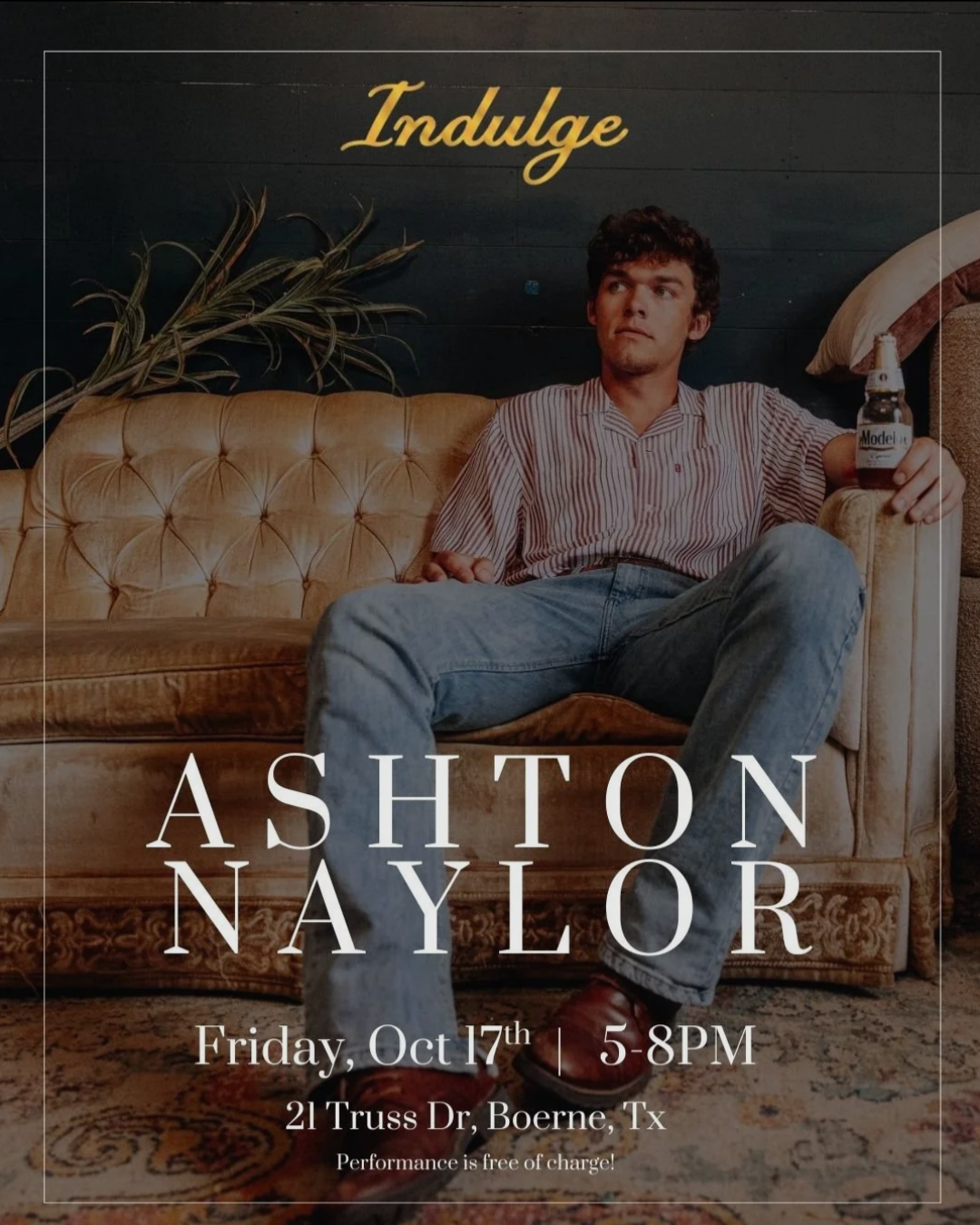 This Friday, join Indulge Wine Bar in an evening of delicious bites and sweet melodies with Ashton Naylor on Friday, October 17th, from 5pm - 8pm.