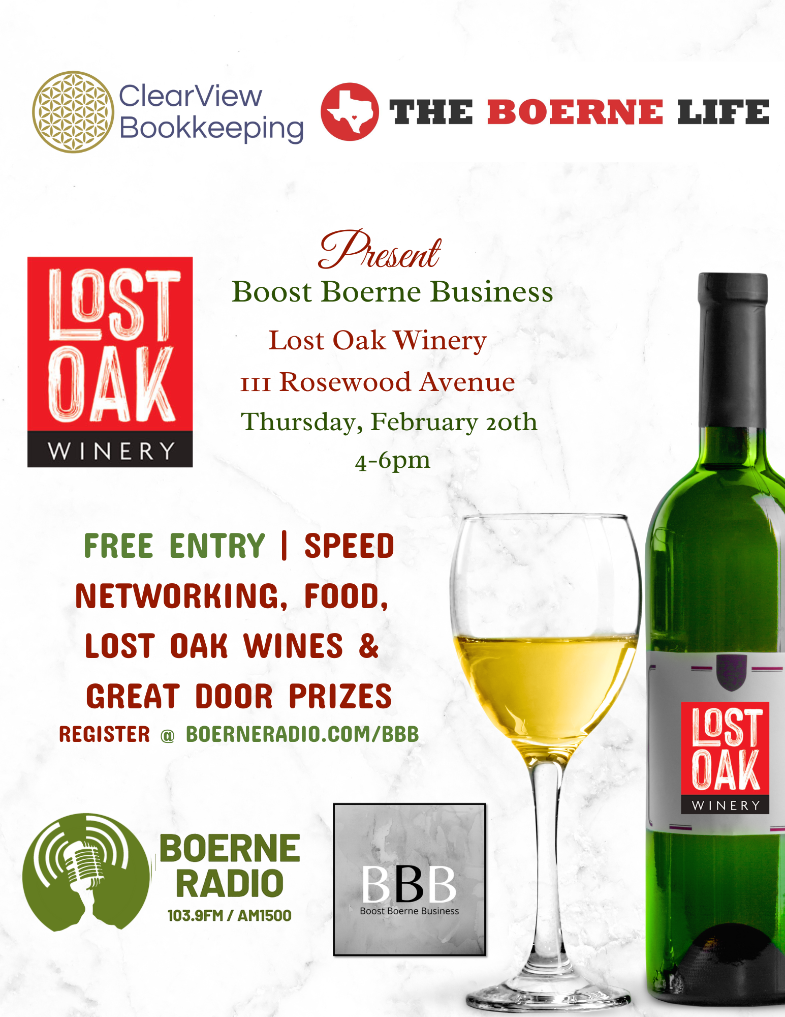 The February 2025 Boost Boerne Business Networking event is made possible by Boerne Radio 103.9FM, Lost Oak Winery, Clearview Bookkeeping & The Boerne Life