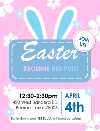 Apr 4 Easter Celebration with H-E-Buddy & Easter Bunny at H-E-B plus! 12:30 pm - 2:30 pm Boerne H-E-B Plus! 420 West Bandera Rd, Boerne Event Details Get Directions