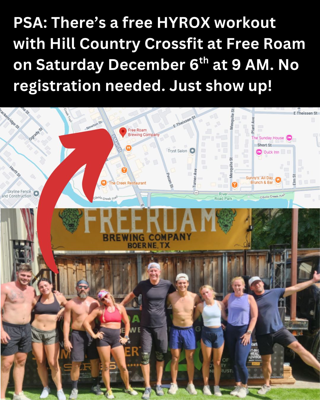 Hyrox style event with hangout after at Free Roam Brewery. Sweat, meet some friends, and enjoy a post-workout cheers.