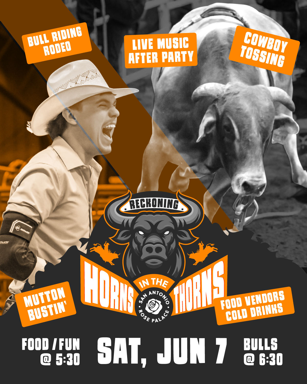The battle comes back to the dirt of The San Antonio Rose Palace on June 7th with Horns in the Thorns round 2! This bull riding PARTY will hit HARD right here in your backyard with tons of bulls, cowboys, Mutton Bustin’, local food, cold drinks, dancing, good company and more.