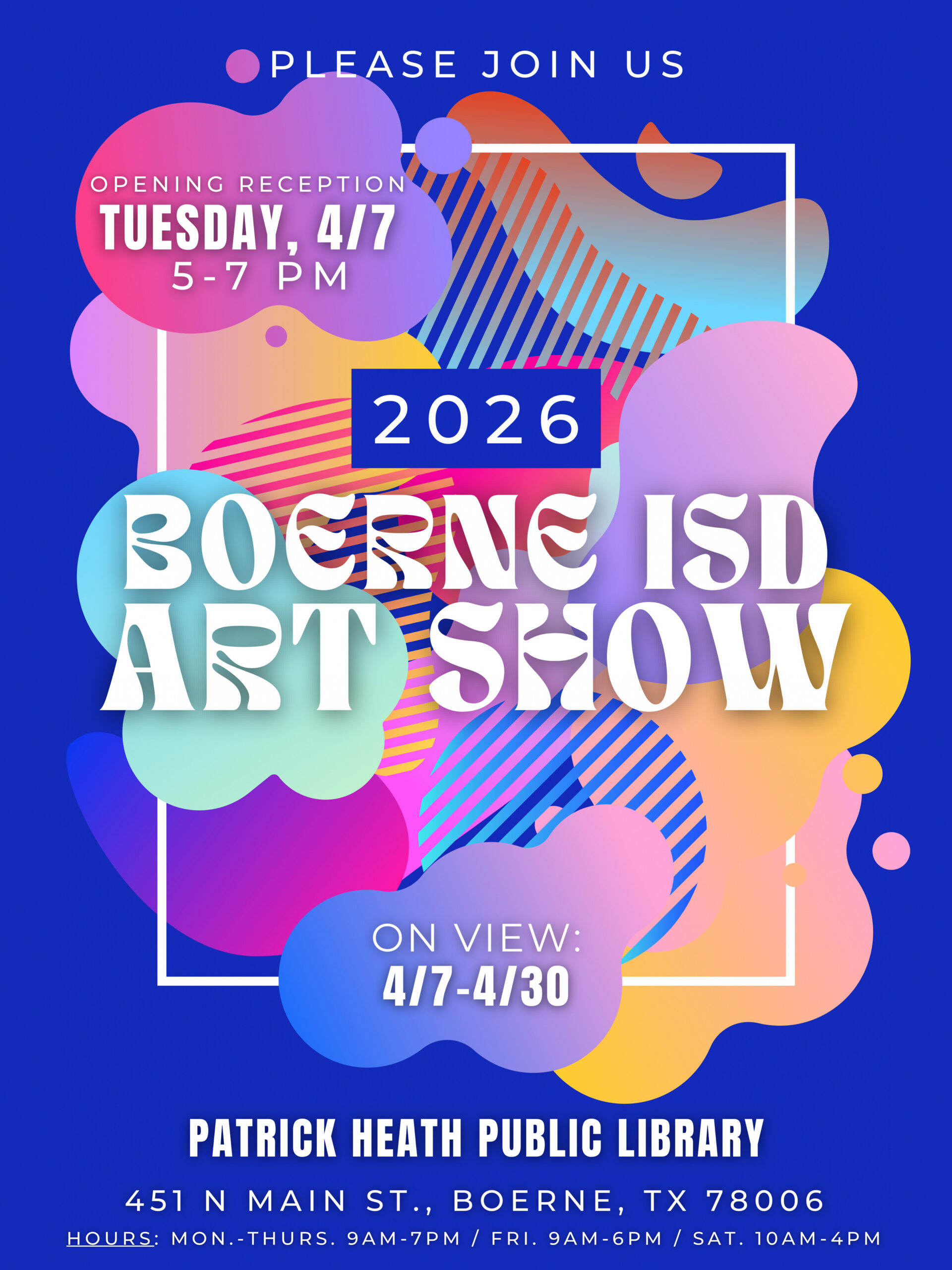 Apr 7 Boerne ISD Art Show Opening Reception at the Library 5:00 pm - 7:00 pm Patrick Heath Public Library 451 N. Main Street, Boerne Event Details Get Directions