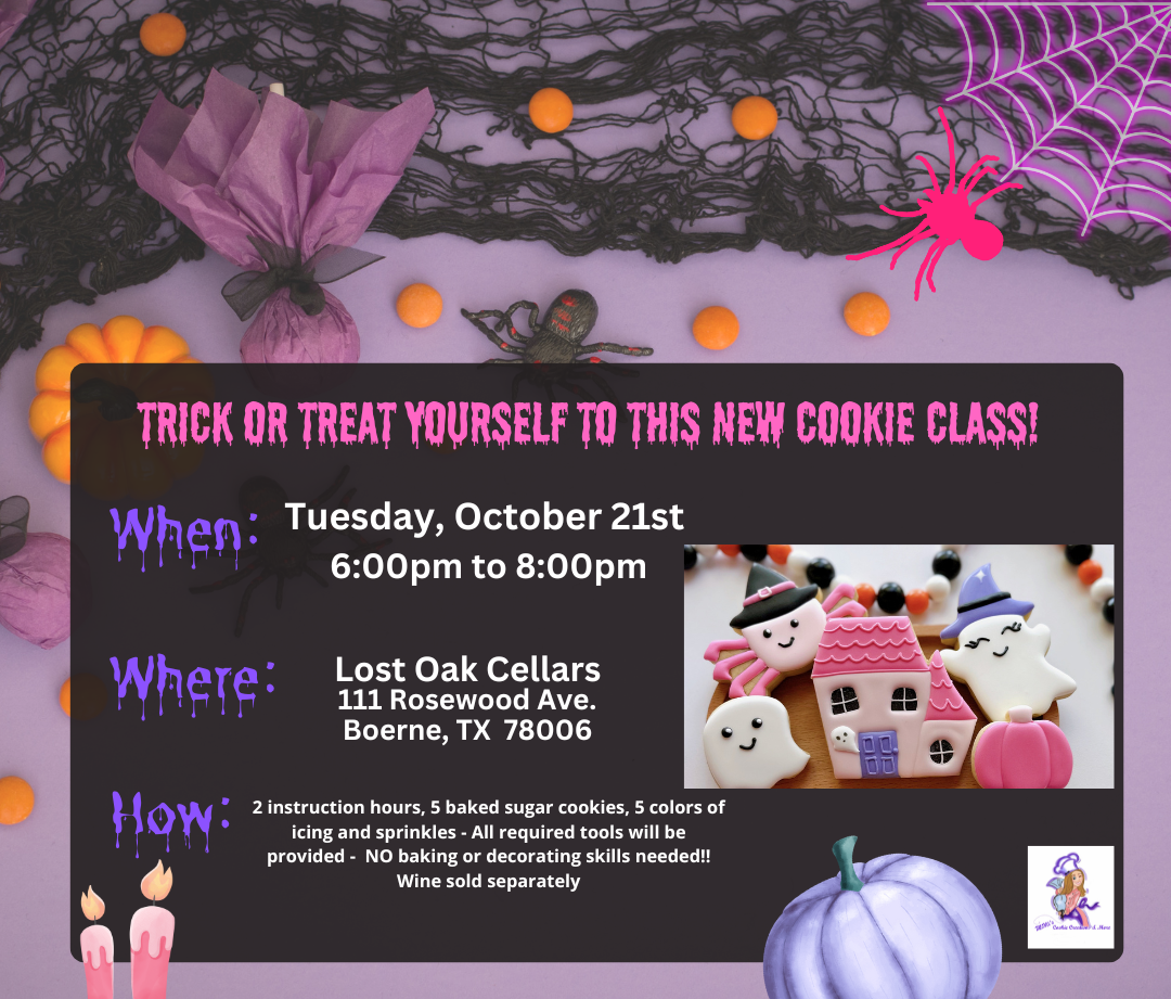 Oct 21 Halloween Cookie Decorating Class at Lost Oak Cellars 6:00 pm - 8:00 pm Lost Oak Cellars 111 Rosewood Ave, Boerne Event Details Get Directions