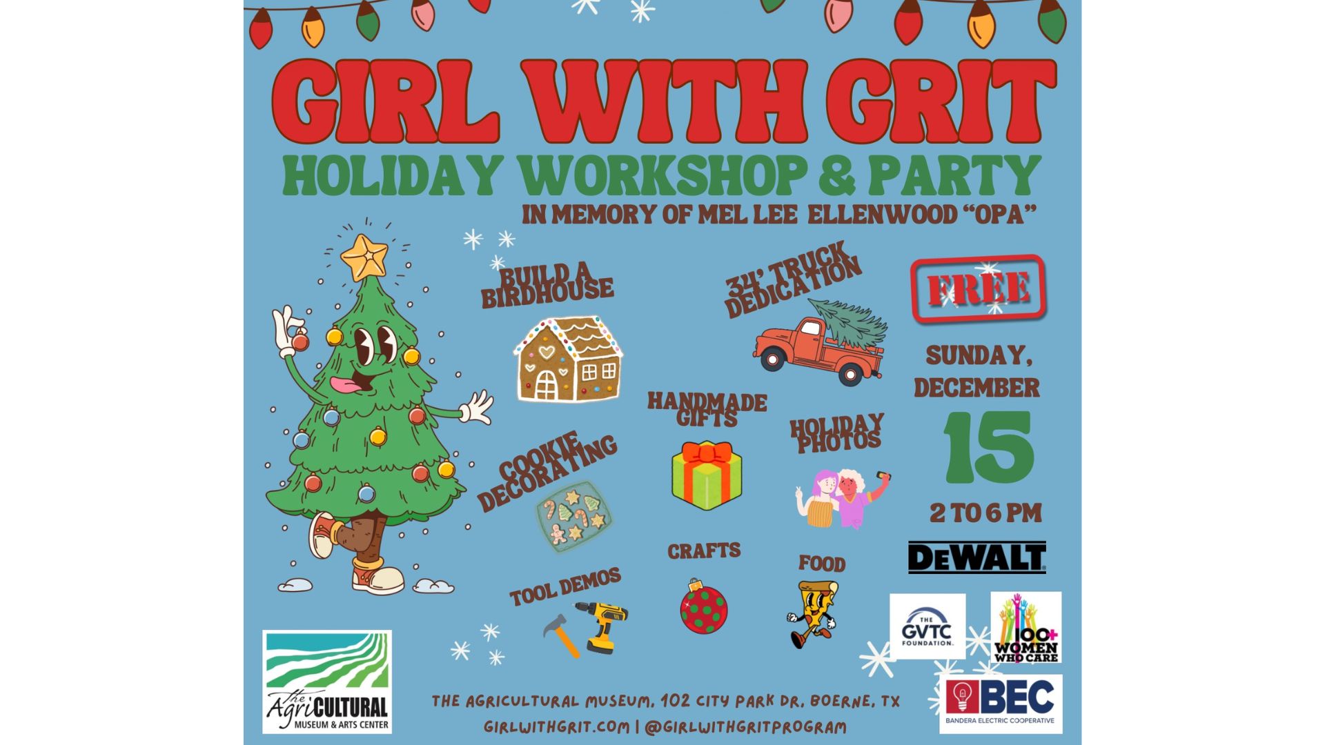 Dec 15 Girl with Grit Holiday Workshop and Party 2:00 pm - 6:00 pm The AgriCultural Museum & Arts Center 102 City Park Rd., Boerne Event Details Get Directions