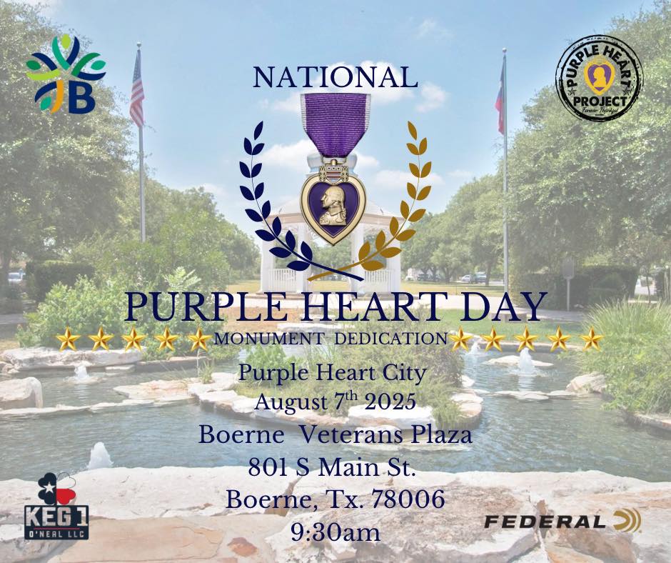 Boerne will host a special Purple Heart Day ceremony on August 7, 2025, beginning at 9:30 am at Boerne Veterans Plaza, 801 S Main Street. The event includes the dedication of a new Purple Heart Tribute Monument and a Purple Heart Park Bench. Attendees will enjoy a live performance by Friends in Harmony and the ... Read more