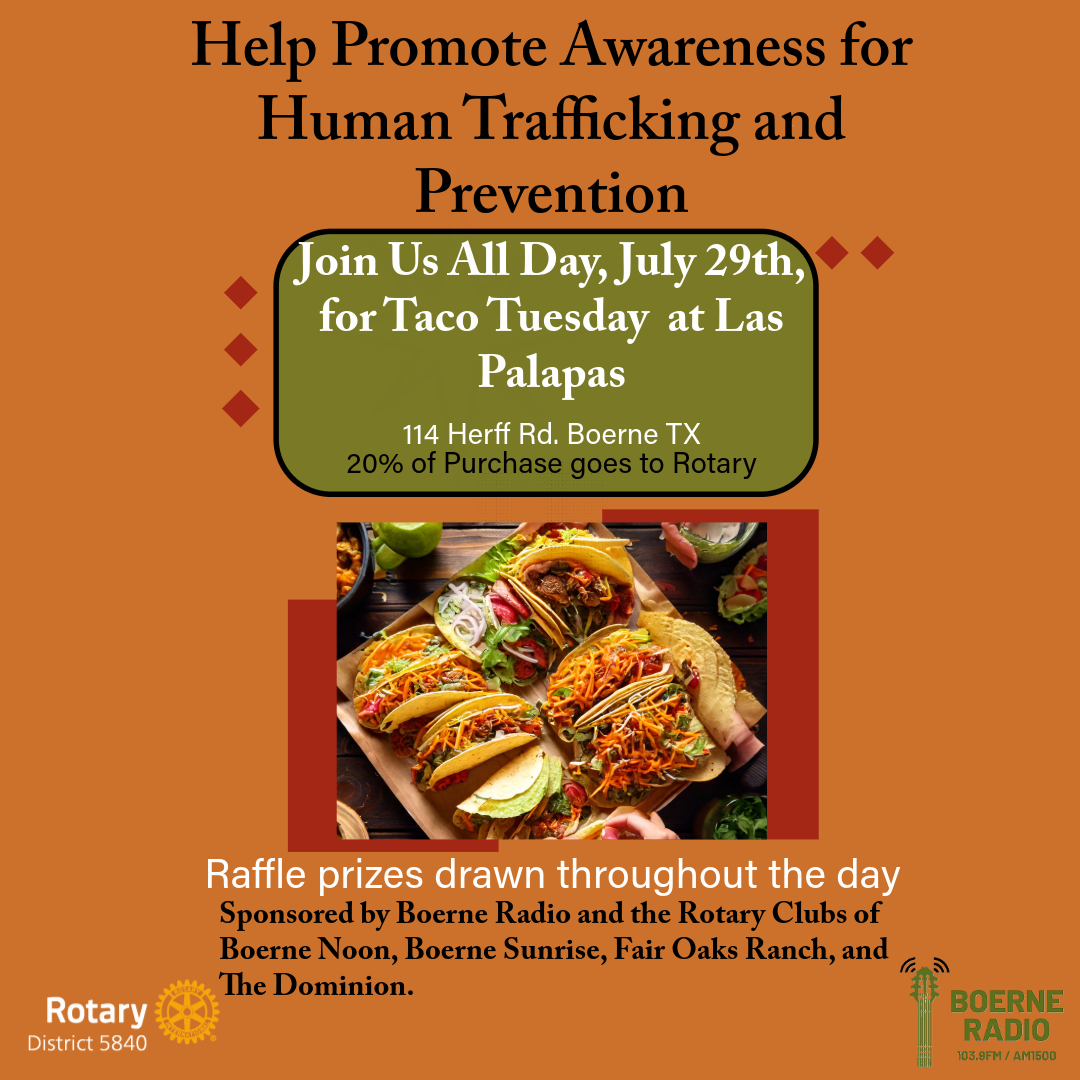 Raise Awareness and Promote Prevention Education about Human Trafficking in our Community Hosted by Boerne Radio, and the Rotary Clubs of Boerne Noon, Boerne Sunrise, Fair Oaks Ranch and Dominion. Learn more about the issue and raise funds for a Fall Prevention Education Event. Raffle Prizes drawn throughout the day.