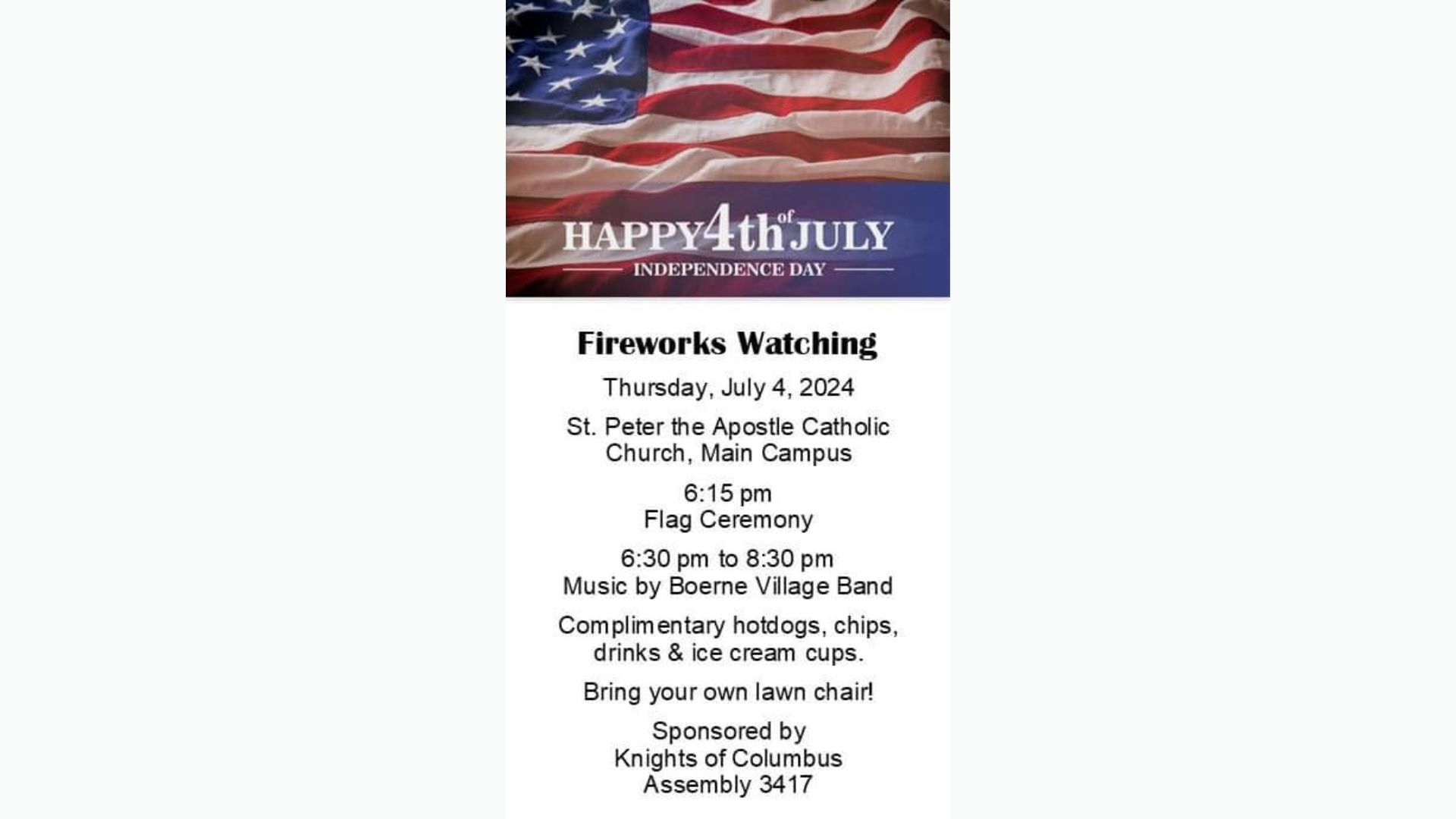 Join St. Peter the Apostle Catholic Church for fireworks viewing and a big party! There will be a flag ceremony at 6:15 pm, and music by the Boerne Village Band from 6:30-8:30 pm. There will also be complimentary food and drinks - including ice cream! Bring a lawn chair!