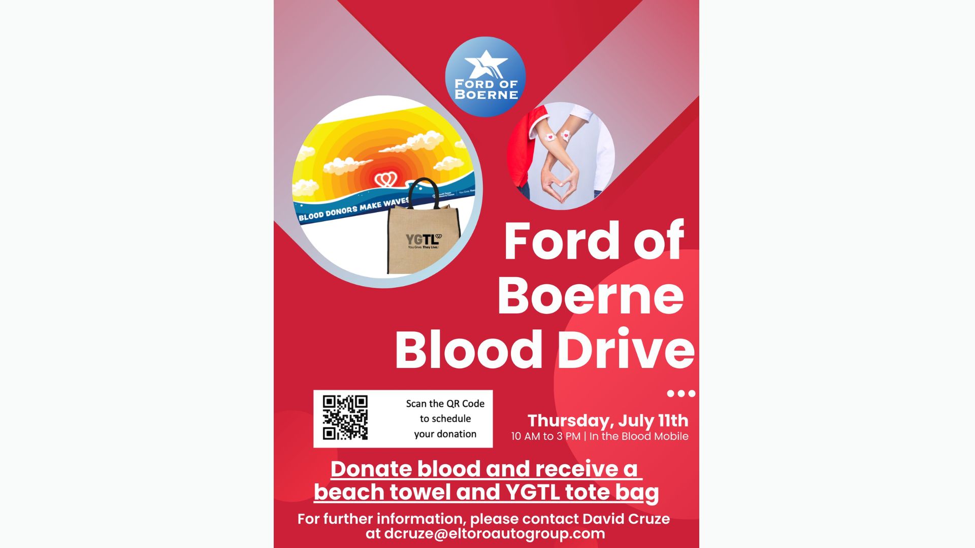 Visit Ford of Boerne Thursday for a life-saving blood drive in collaboration with South Texas Blood and Tissue! The Blood Mobile will be ready from 10am to 3pm, and donors will receive a beach towel and tote bag—ideal for summer fun! Contact dcruze@eltoroautogroup.com for more information.