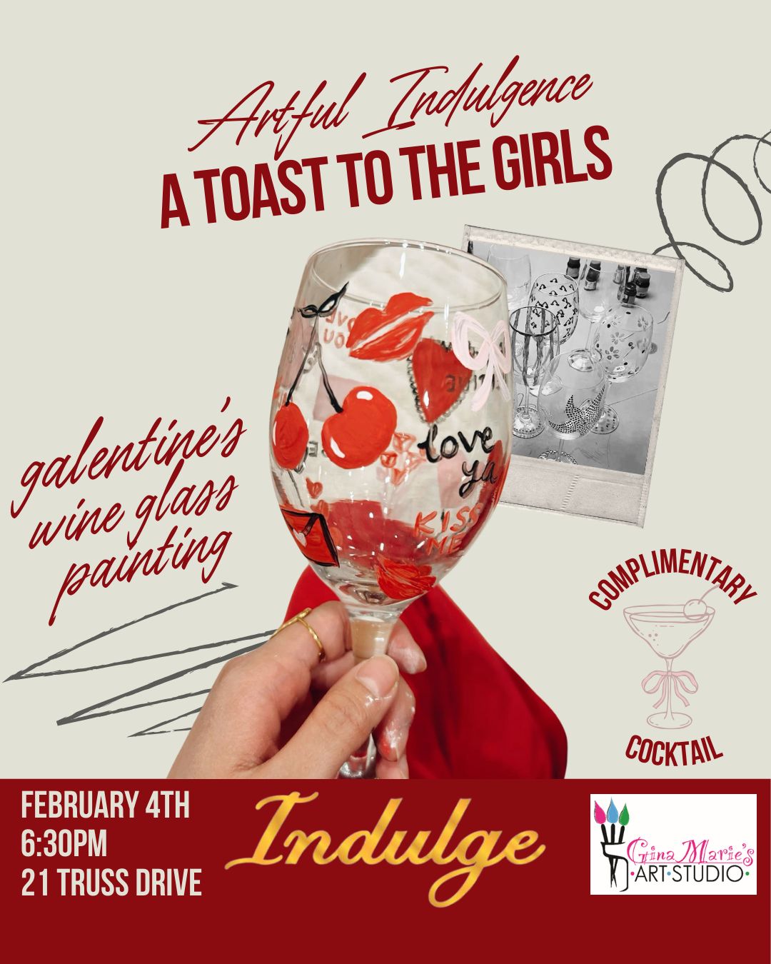 Celebrate friendship Wednesday, February 4th at 6:30 pm with a Galentine’s wine glass painting event at Indulge. Creative, colorful, and very social. These ALWAYS sell out, so secure your tickets here.