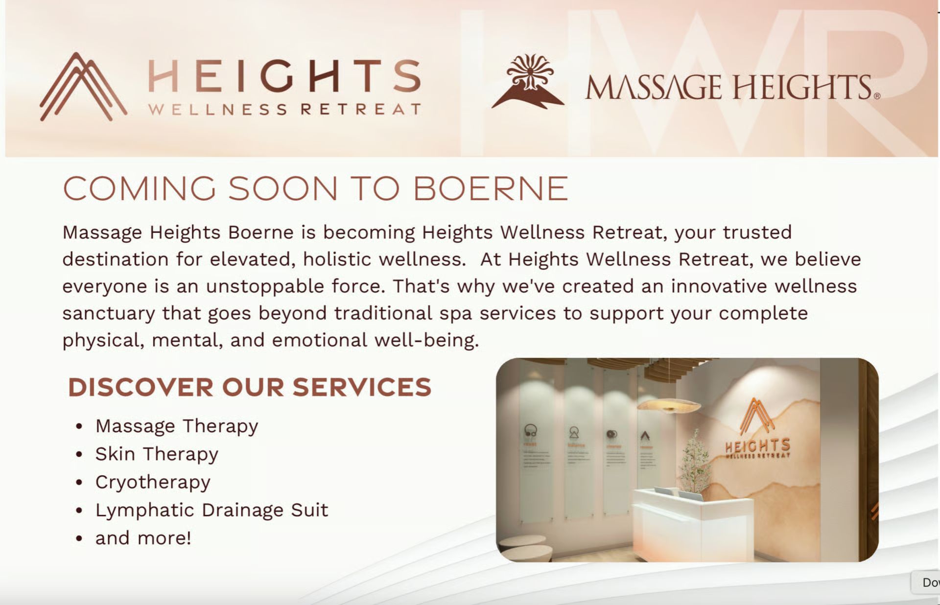 A familiar wellness destination in Boerne is continuing its transition into something new. Formerly Massage Heights, the business is rebranding as Heights Wellness Retreat, reflecting a broader focus on whole body wellness, recovery, and preventative care.