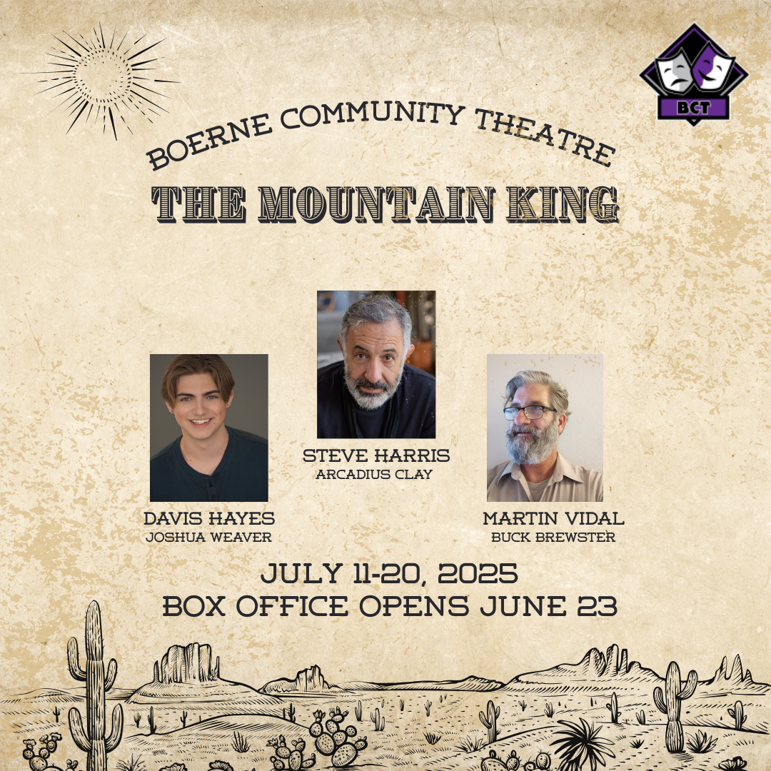 907 E. Blanco Rd. Boerne, Texas 78006 907 E. Blanco Rd, BoernePurchase tickets on our website: https://boernetheatre.org/mountain-king-july-2025/ Set in the badlands of the Dakota Territory in 1876. Joshua is a naive young greenhorn from back east. Kady is his debaucherous and drunken old trail guide. The story follows this odd couple, alone on a long trail through the wilderness, as they travel to rendezvous with Buck ... Read more