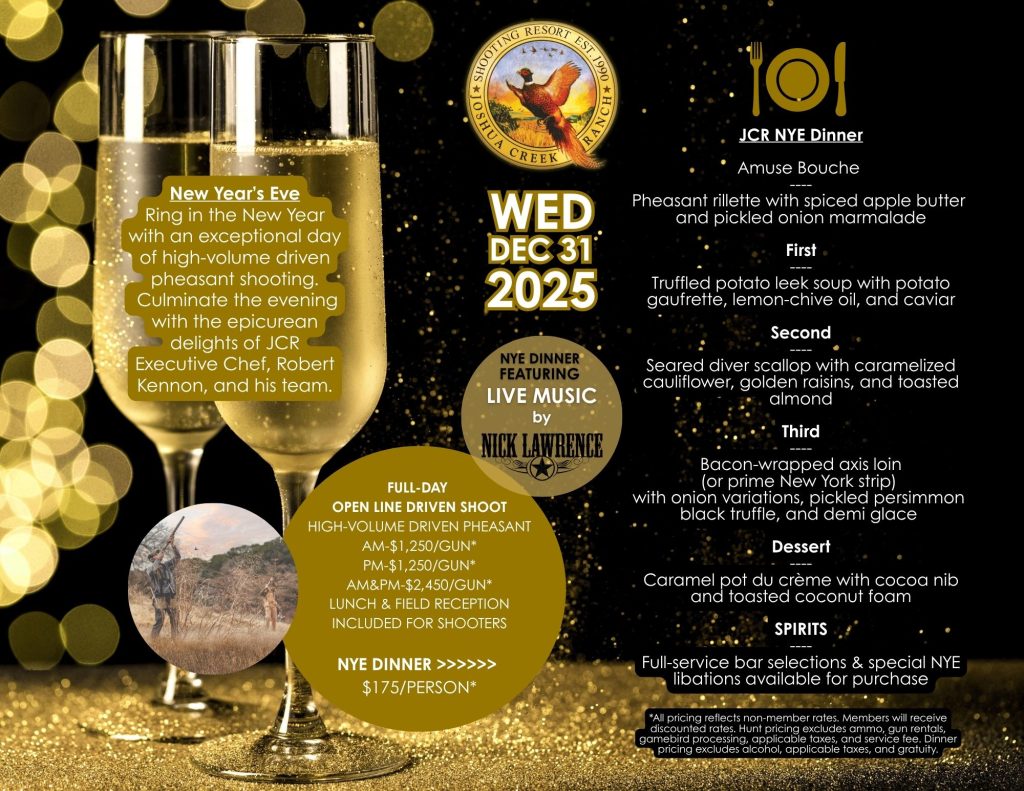 Joshua Creek Ranch is offering a full-day Open Line high-volume driven pheasant shoot on New Year’s Eve, followed by a special dinner prepared by Executive Chef Robert Kennon. Guests can book the AM & PM shoot together for the full experience, or locals and members can reserve the dinner only. All offerings are a la carte, so you can build the celebration that fits your plans.