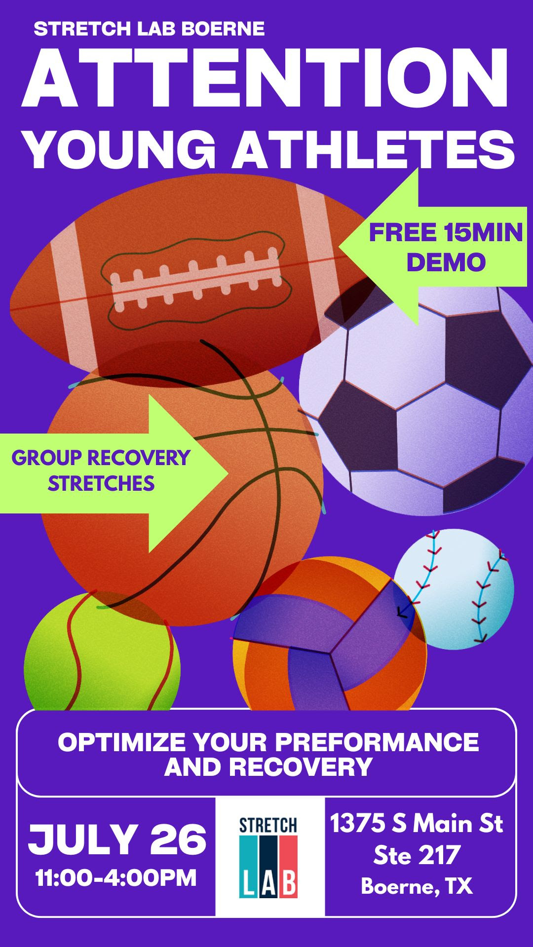 ey Boerne Athletes & Families, If you're a student-athlete—or the parent of one—you won’t want to miss this! StretchLab Boerne is hosting a special event for young athletes on July 26th from 11:00 AM to 4:00 PM — designed to boost performance, support recovery, and prevent injury through 1-on-1 assisted stretching and group recovery techniques. What to Expect: ... Read more